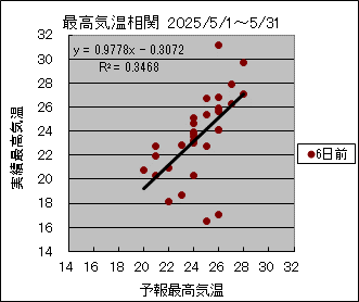 最高気温および最低気温予報値と実績値との相関 ( 2025/5/1〜5/31)