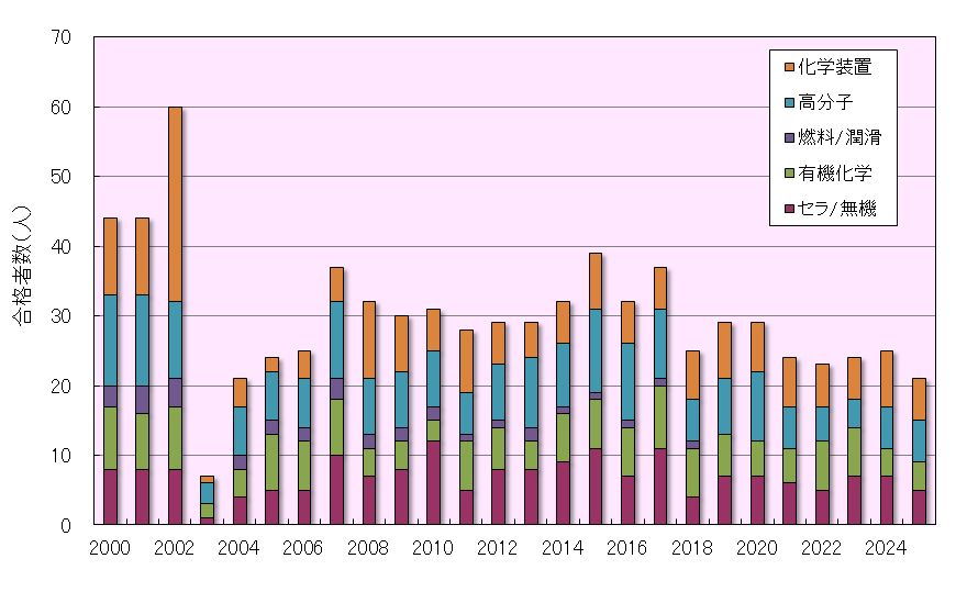 JABEE認定コースを修了した化学部門の第二次試験合格者は、平成27年(2015年)度に初めて1名誕生したのち、2025年度までに累計31名となっています。なお全部門のJABEE認定コース修了第二次試験合格者は、2025年度までに累計4,474名(単純合計:複数部門合格者分考慮せず)となっています。