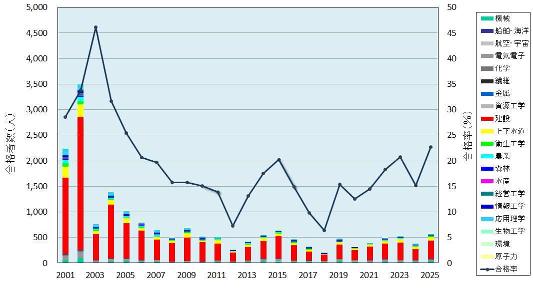 総合技術監理部門の合格者数と合格率(対受験者)の推移をグラフで示します。